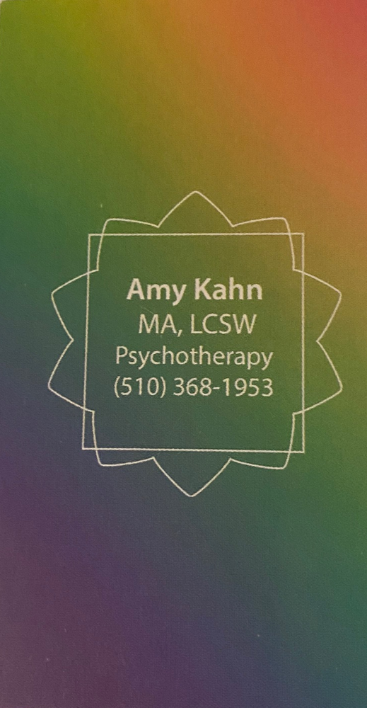 Amy Kahn, LCSW, psychotherapist. My focus is on helping you overcome challenges which may be blocking your path to living life to its fullest, or interfering with your relationships. I use an eclectic approach to include CBT and EMDR. I provide care to people of all cultural and religious backgrounds with sensitivity, acceptance and understanding. I also provide care to gay, lesbian, trans, bi or questioning clients, y si se habla Español.