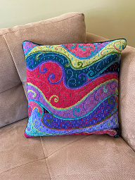 Full of color and swirls. Adorn your couch with this bright abstract art. 100% Hand-stitched by the artisan with wool thread. Measures 15x15". The pillow is backed with cotton canvas and a hidden zipper for the pillow insert (included)
