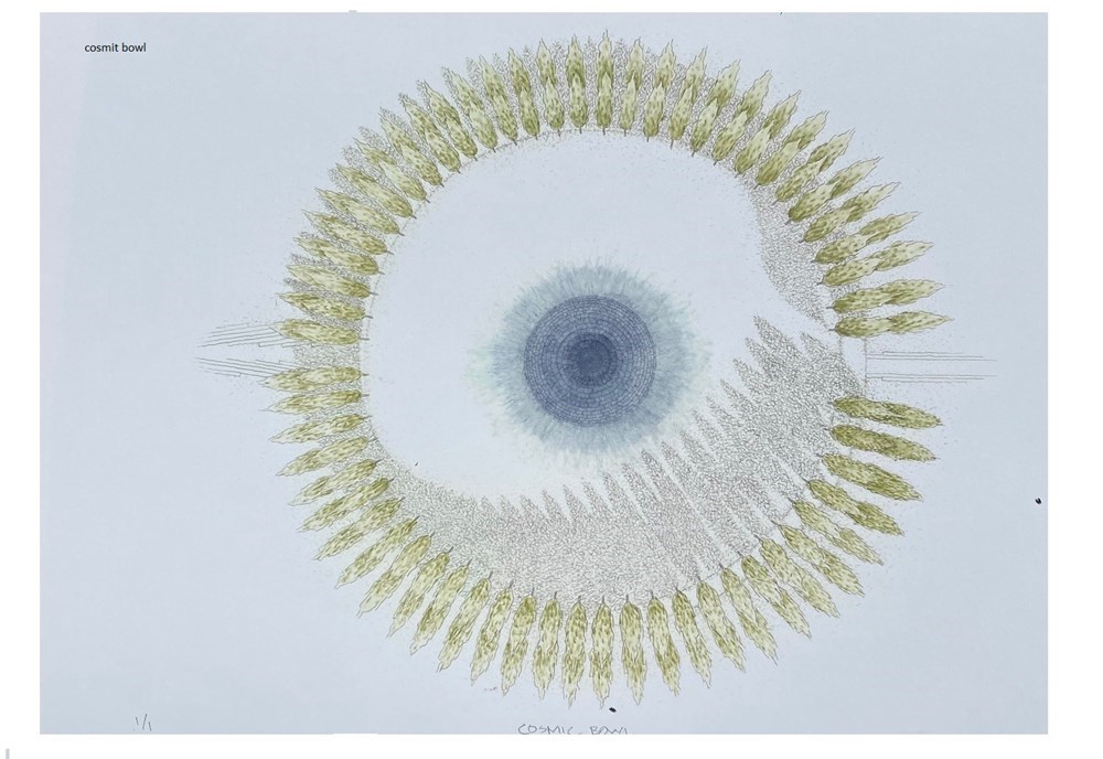 COSMIC BOWL - 2022 Artist – David Meyer Pencil etching with watercolor and pastel overlays 16” x 16” Limited Edition Giclee print, #6 of 10 290 GSM 100% cotton paper Heartwood Preserve is a 500-acre development/climate change public works project in Omaha, Nebraska. The project incorporates a series of sculpted earthen vessels, designed to display, and cleanse 170 acre-feet of stormwater, recharge aquifers and mitigate flooding. The largest vessel of them all, the Cosmic Bowl pays homage to the pothole prairies that once dotted the native landscape. To read more about the project, visit the projects at ms-la.com website. As ecological art forms, the vessels were captured in a series of drawings, including the Cosmic Bowl that is up for auction.